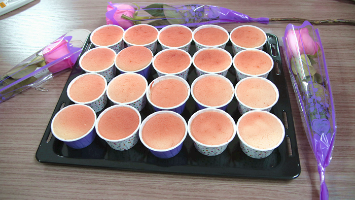 將做好的蛋糕液細(xì)心地裱入紙杯中,