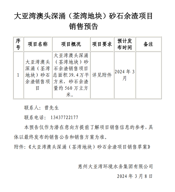 大亞灣澳頭深涌(荃灣地塊)砂石余渣項(xiàng)目銷售預(yù)告
