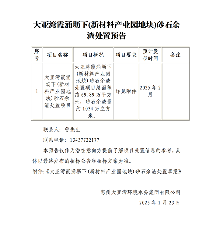 大亞灣霞涌壢下(新材料產業(yè)園地塊)砂石余渣處置預告